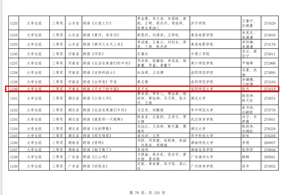 由教育部、国家语言文字工作委员会主办的第五届中华经典诵写讲大赛“诵读中国”经典诵读大赛已完成全部赛程,获奖名单已公示。河南省人文社科重点研究基地中原戏剧影视文化研究中心学子吴子龙在此次大赛中斩获佳绩,其朗读的作品《月光下的中国》在大赛中荣获大学生组三等奖。